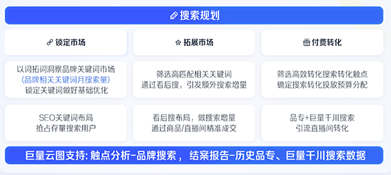 而在搜索策略上,商品卡優化、SEO、品專建設是做好搜索運營的關鍵。商家可以從巨量云圖、巨量千川、電商羅盤找到潛力詞,選出重合度較高的關鍵詞重點優化。同時篩選出匹配度高的相關關鍵詞,通過看后搜引發額外搜索增量。然后找到高效轉化觸點,確定搜索投放預算分配,使用搜索品專+巨量千川搜索引流直播間轉化。