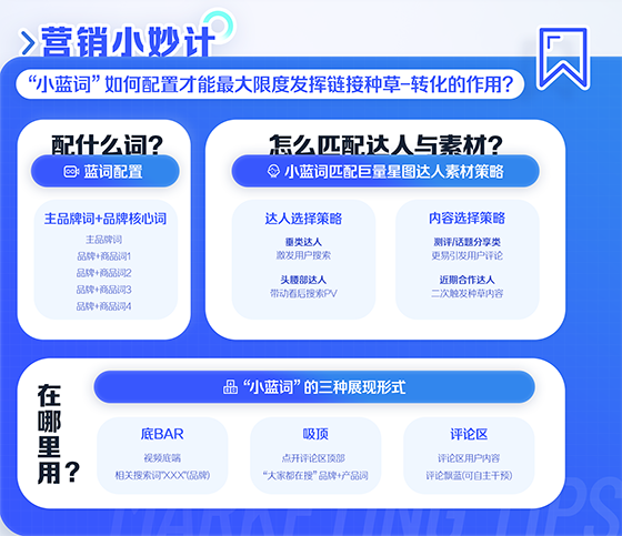 那么如何配置小藍詞才能最大限度發揮鏈接種草/轉化的作用?經過數據驗證,主品牌詞+品牌核心詞/商品詞是比較有效的搭配。匹配達人方面,垂類達人更易激發用戶搜索,頭腰部達人更能有效帶動看后搜 PV 。內容選擇上,測評和話題分享類更易引發用戶評論,與近期合作達人共創有機會二次觸發種草內容。