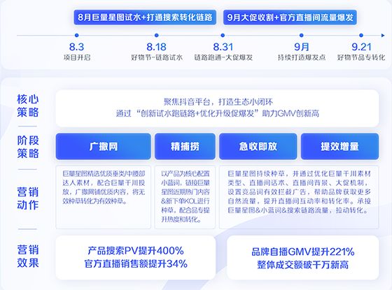 2022 年,御泥坊推出新品 V800 玻尿酸次拋精華。品牌選擇聚焦抖音平臺,使用小藍詞催化劑,縮短種草-搜索-轉化鏈路。御泥坊以產品為核心配置小藍詞,鏈接巨量星圖近期熱門內容以及新下單的 KOL 進行種草,在產品上新期過后持續提升搜索熱度和轉化率。最終,搜索 PV 提升 400% ,品牌自播 GMV 提升 221%。