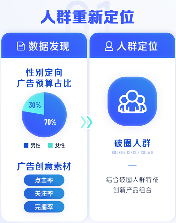 相較于其他行業,3C 品牌不僅客單價高,男性用戶占比也更高,需要重新定位“人貨場”。品牌可以從巨量千川過往的投放數據中洞察新目標人群,觀察短視頻內容在不同性別、年齡段人群的完播率、商品點擊率等數據,挖掘以往投放預算少,但互動率較高的人群作為新目標人群。