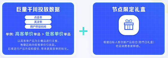 確定“人”后,商家即可根據不同產品投放反饋的點擊率、轉化率、用戶停留時間等數據選擇主推產品。比如高客單價產品可在主推款售罄后轉推低價引流款,根據不同節日對應的人群特點,推出節日限定禮盒。