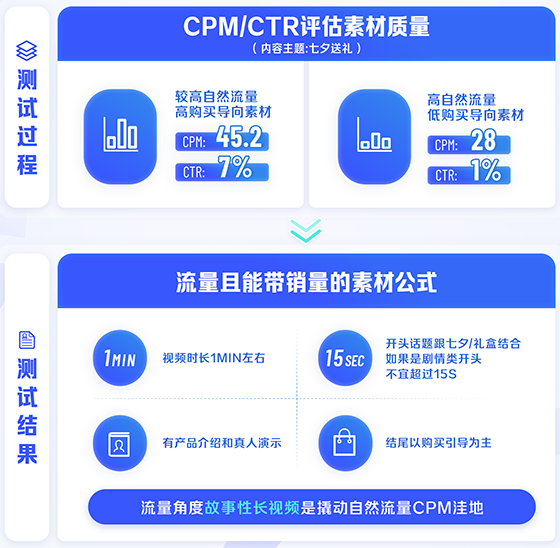 此外,商家在大促直播后還可對產品賣點素材重新剪輯,制作達人混剪、產品展示、微劇情等短視頻投放素材,小預算測試不同節點合適的內容類型,使用巨量千川定向投放功能,復投高潛力人群,利用長尾效應,最終實現人群破圈,品效雙增長。