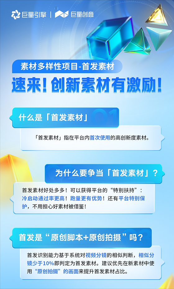 對此,巨量引擎提出一個概念——「首發素材」。所謂「首發素材」,指的是指在巨量引擎平臺內首次使用的高創新度素材。它的判斷依賴機器識別,判斷邏輯為:當一條素材與其他素材的相似分鏡在其視頻中占比低于10%時,則判定為首發素材。