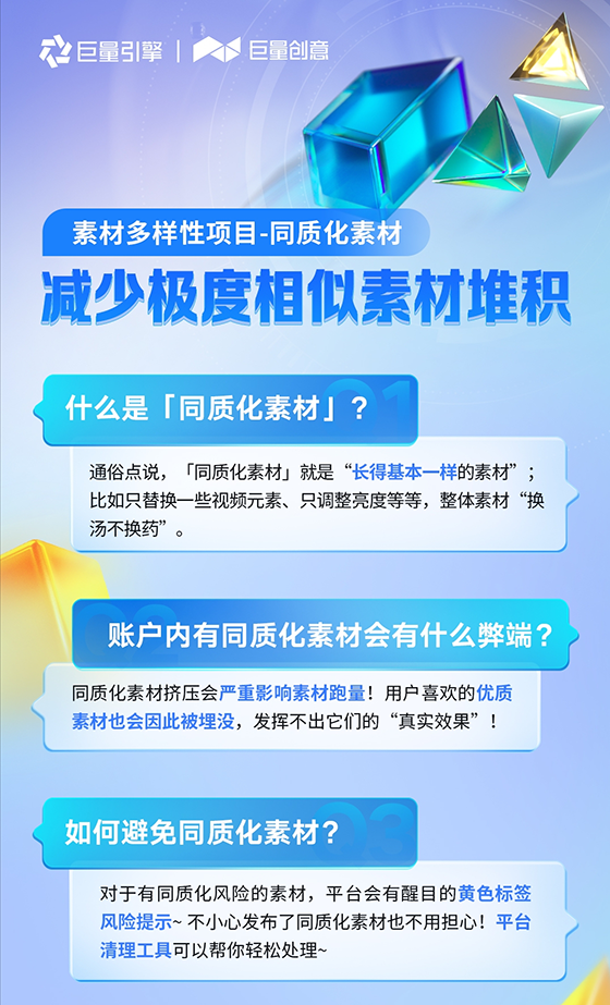 為緩解素材擠壓問題,提升素材探索效率,巨量引擎上線同質化素材策略。所謂同質化素材,包括但不限于:只改背景音樂、只刪除/增加少量片段,只調整了片段順序,只增加了特效、字幕等的素材,或畫面相似度非常高的素材。當賬戶內已經堆了一些同質化素材,造成了「同質化擠壓嚴重」的情況時,擠壓嚴重的同質化素材將自動進入排隊,只有在使用清理工具,清理了在投放中但效果不滿意的素材后,同質化擠壓情況才能得到緩解。