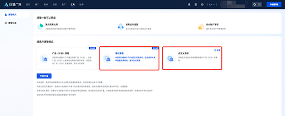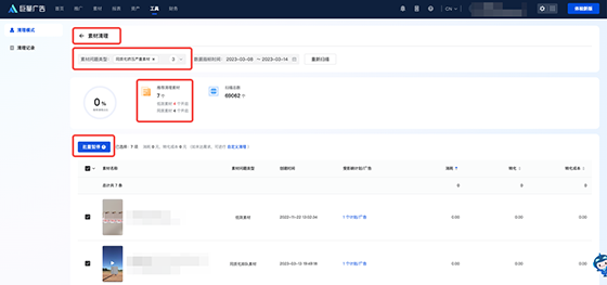 保持至少3天清理素材的習慣,如果能每天清理最好;在巨量廣告或巨量廣告升級版的「工具」板塊,有專門的素材清理工具,點擊素材清理,即可批量暫停平臺推薦清理的低效和同質素材;