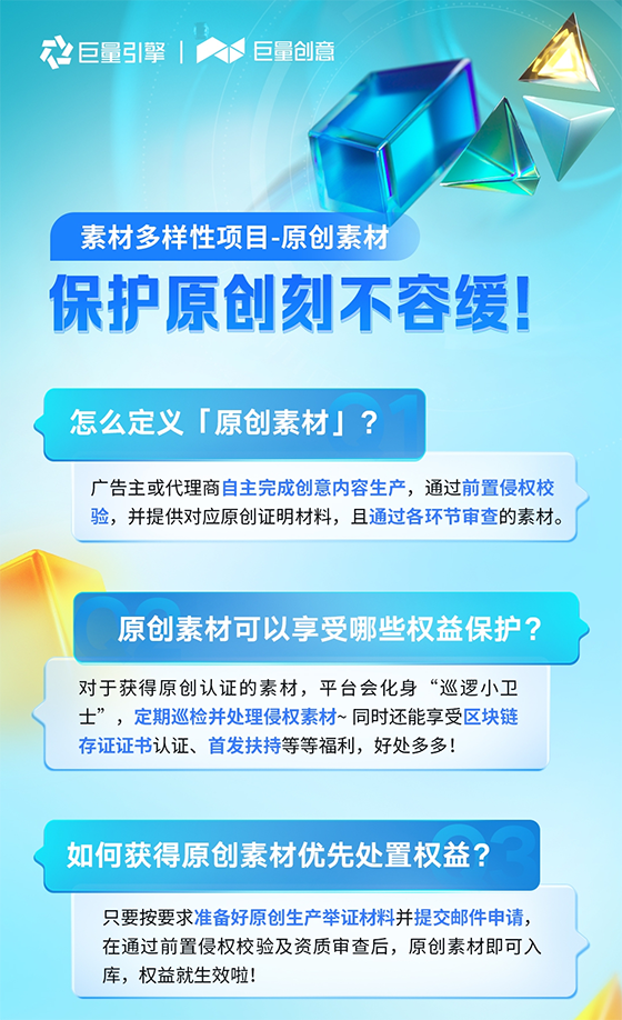 新一期原創素材門檻更加友好,并將為優先原創素材生產占比較高的直客、代理,提供保護通道。廣告主可通過「原創素材-侵權優先處置白名單入口」進行提報,為自身原創素材提供更高效的保護。