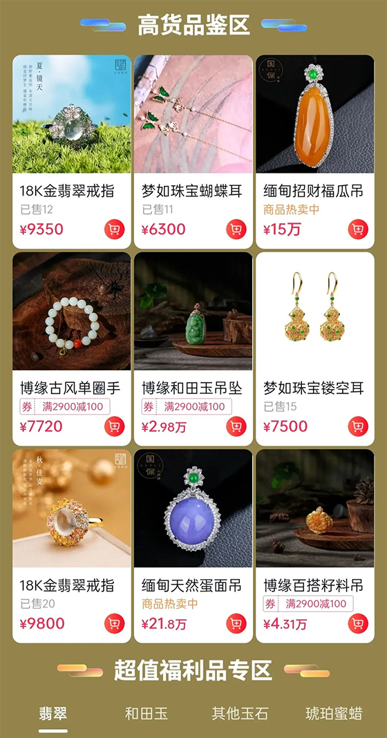 三方數據顯示,有62%的受訪網民偏好從電商平臺消費國潮商品。在電商消費場景中,用戶不僅會被優質的科普、售賣玉石的直播內容所吸引,同時也會在“邊逛邊買”的貨架場景中,被福利活動、優價好物所吸引。
