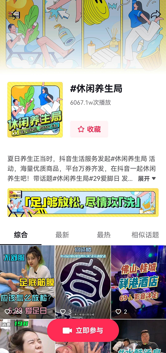 隨著休閑養生大潮興起,人們對休閑和養生的實踐認知不斷提高,養生逐漸成為新的消費熱潮。“千里之行始于足下”,抖音生活服務攜手洗浴按摩頭部商家共同發起活動#休閑養生局、打造“29愛腳日”專屬行業節點。