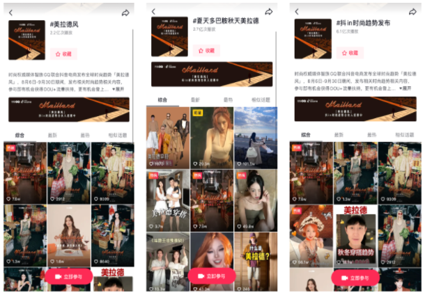 8月,抖音電商「抖in時(shí)尚趨勢發(fā)布」聯(lián)合時(shí)尚媒體《智族GQ》共同發(fā)布時(shí)尚趨勢“美拉德風(fēng)”,此后多位時(shí)尚作者參與話題討論,吸引更多平臺(tái)達(dá)人和用戶參與到“美拉德風(fēng)”的趨勢當(dāng)中。
