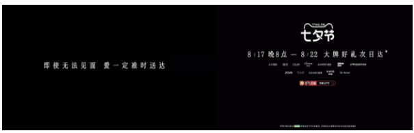 在用情感內(nèi)容吸引關注之外,天貓還巧妙地在內(nèi)容傳播中綁定了物流業(yè)務。洞察到異地情侶對送禮的時效需求,天貓聯(lián)合AMIRO、韓束、海藍之謎、olay、SK-II、JOVS等一眾大牌推出“大牌好禮次日達”物流服務,在七夕期間一起助力讓愛準時送達。在七夕短片的結(jié)尾處,天貓也打出了“即使無法見面,愛一定準時送達”的情感標語,通過貼合短片情感洞察的軟性植入,快速占位七夕主場。