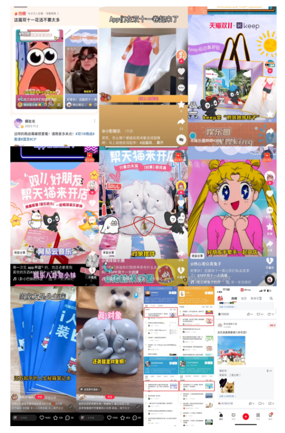 除合作平臺主動推廣造勢之外,此次跨世紀合作事件,還在抖音、快手、小紅書,乃至豆瓣和虎撲上引起熱議,成功卷入各圈層用戶群體。各領域達人圍繞天貓聯動產品及事件進行腦洞創作,多個爆款作品走紅,引發#這屆雙十一花活不要太多 熱榜話題討論。