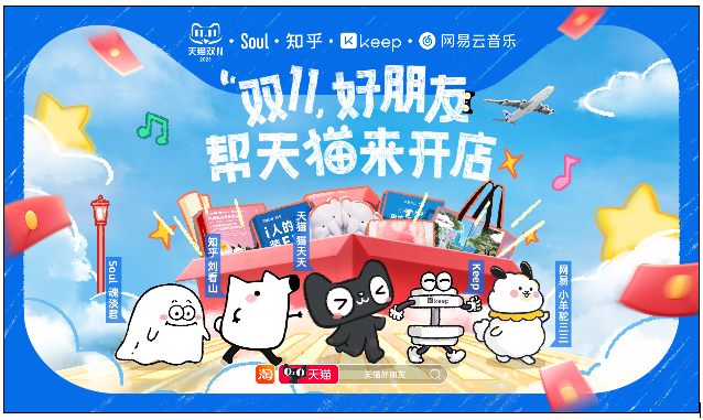 天貓作為雙11老大哥,今年又再出奇招。不僅自己在站內大操大辦,還邀請了大家意想不到的“朋友們”一起來開店。這次天貓攜手4家主流平臺Soul、網易云音樂、知乎、Keep,為雙11收官打造了一場聯合營銷事件。在雙11和天貓IP的強力號召下,各大平臺紛紛拿出趣味又上頭的腦洞產品,以極具關注度的傳播玩法撬動泛娛樂用戶的注意力,為雙11收官再創一波新高潮。