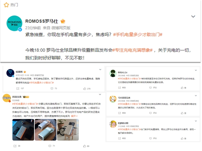 回顧#手機電量多少才敢出門#這一熱議話題,其中“出行用電焦慮”、“用電困難”、“充電寶重量負擔”等問題持續刷屏,說明這些問題已經成為大眾用戶的普遍用電痛點。作為充電領域的領軍品牌,羅馬仕憑借其敏銳的市場嗅覺,早已捕捉到這些問題。