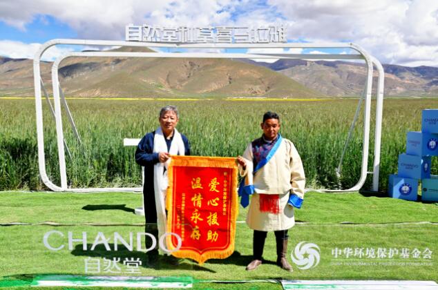 儀式現場,拉孜縣錫欽鄉崗西村村民委員會分別向中華環境保護基金會、上海市第十批援藏干部聯絡組、自然堂集團贈送錦旗。