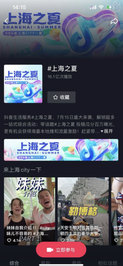 線上,抖音生活服務在抖音上線#上海之夏 話題,并采用話題排位賽的機制,鼓勵上海本地商家、達人以及在滬游客踴躍參與,分享他們的精彩瞬間與獨特體驗。