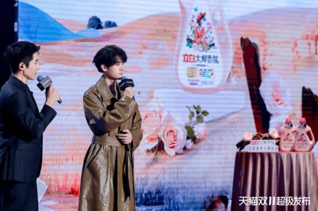 立白請到周翊然作為“立白大師香氛摩登大使”,推薦新品“大師烏木絲絨玫瑰洗衣液”,現(xiàn)場尋香,讓觀眾品味到沉穩(wěn)醇厚的香氣,持久留香72小時,像一位溫暖的朋友陪伴在身邊,讓身邊人“花香潔凈的DNA動了”。