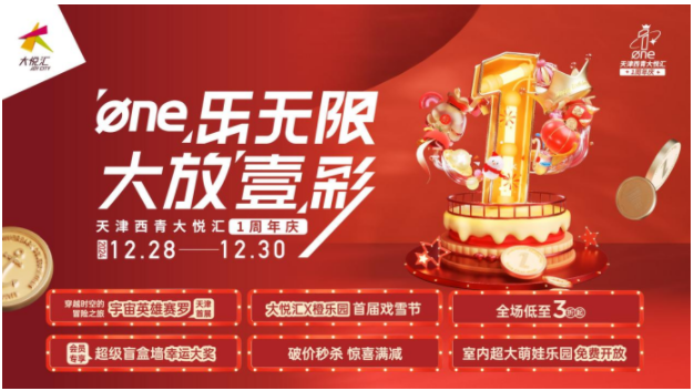 本次周年慶活動期間,天津西青大悅匯將圍繞“one樂無限·大放壹彩”的主題,在引入、共創、原創等多個層面展開積極探索,融入全民IP、互動NPC、兒童劇、戲雪、盲盒等元素,為消費者帶來源源不斷的驚喜。