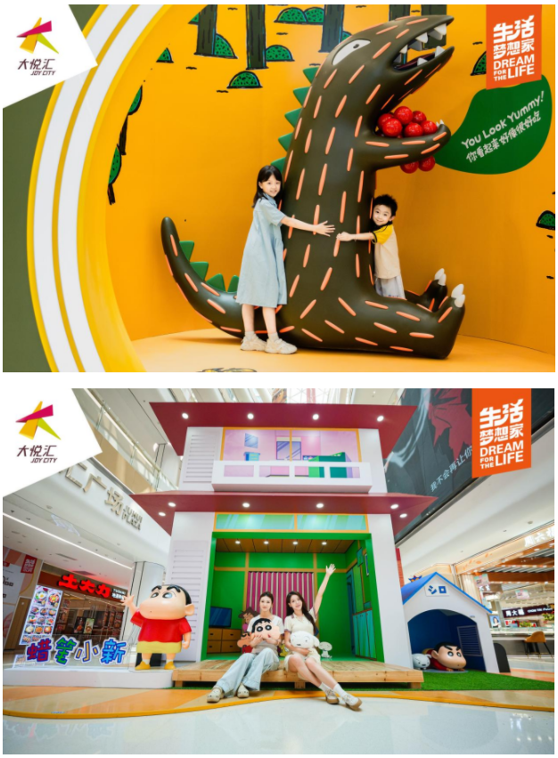 如今各種類型的IP展覽都是購物中心營銷活動的重頭戲,天津西青大悅匯也不例外。開業之初,恰逢春節期間,天津西青大悅匯攜手知名IP「我不是胖虎」帶來「肥龍胖虎哏都奇遇記」龍虎呈祥華北首展,龍年生肖、潮流IP、中式美學的結合,5大互動體驗承載天津文化;今年6月,天津西青大悅匯引入宮西達也「我是霸王龍」誕生20周年特展天津首展,在展區內結合繪本故事情節打造了2.5米霸王龍裝置、雷奇劇場、紅果子樹林、多媒體蹦床及星空下滑梯等多個兒童參與場景,吸引眾多親子客群前來打卡,為消費者帶來全新的視聽和游憩體驗。此外,還有蠟筆小新主題快閃店「請來我家做客噢」天津首站,現場100%還原野原家獨棟別墅建筑,推出了200+正版周邊產品,吸引了大量家庭和動漫愛好者前來消費打卡、互動體驗,銷售及客流實現雙引爆。開業一年以來,天津西青大悅匯通過引入IP展,賦能物質消費以外的更多情感追求,使得消費者加速形成對項目的深刻記憶,助推項目成功出圈。