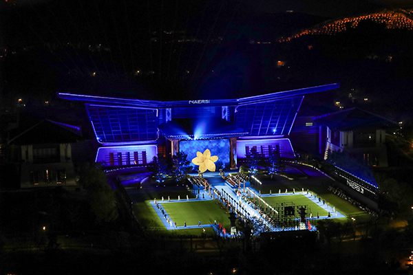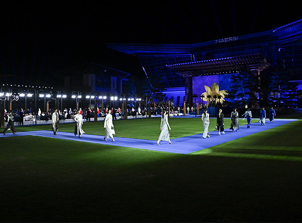 秀場(chǎng)設(shè)計(jì)以“加冕禮”為核心,選址于世界級(jí)峰會(huì)的國(guó)際會(huì)都——北京雁棲湖國(guó)際會(huì)議中心上演,時(shí)尚與自然、人文藝術(shù)在此交織加冕盛宴。NAERSI標(biāo)志性25°藍(lán)渲染夔龍紋迎賓道,象征通往榮耀的加冕之路。秀道中央百合藝術(shù)裝置匠藝盛綻,為女性獻(xiàn)上優(yōu)雅冠冕。曾創(chuàng)編百余部國(guó)際大型音樂(lè)會(huì)作品的著名作曲家李勛先生受邀作為大秀音樂(lè)總監(jiān),以交響樂(lè)團(tuán)奏響典雅樂(lè)章,與立體光影秀形成視聽(tīng)共振,營(yíng)造出古典歌劇院般的典雅氛圍,模特們身著優(yōu)雅臻裝從容緩步,經(jīng)典與創(chuàng)新在同一空間碰撞、交融,綻放內(nèi)蘊(yùn)女性優(yōu)雅精神的時(shí)裝風(fēng)尚。