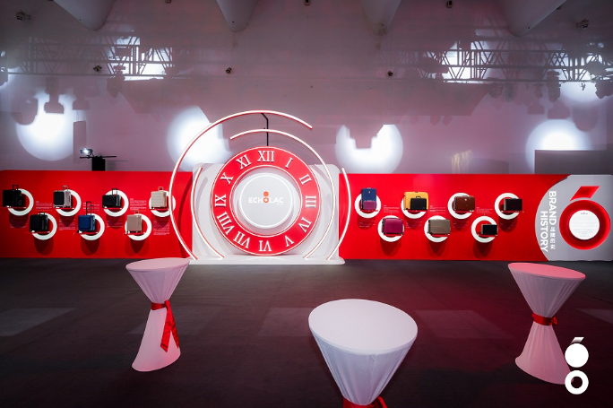 愛可樂60周年盛典以「BEYOND TIME」為敘事主線,賓客穿梭時光拱門,在以經典產品為線索的光影中啟程。主會場的先鋒視覺構建摩登質感,多重體驗空間的規劃為到場賓客串聯起品牌歷史與未來相互交織的璀璨篇章;中央環形吧臺巨大的“ECHOLAC 60TH ANNIVERSARY”燈箱耀眼奪目,現場島臺的概念表達結合鐳射光線,聚焦并點亮品牌經典系列之一的NEW SHOGUN巨物裝置;側方“時光之墻”以時間為維度演繹產品迭代——從品牌輝煌歷史開始,懸浮展柜陳列歷代經典產品,呈現愛可樂的榮耀瞬間;創意時鐘互動墻記錄嘉賓歡聚影像;終端則展示品牌引領當下及未來的全新產品,帶來更多出行風尚。