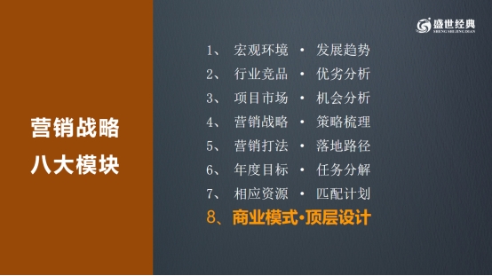 為了讓效果可控可落地,盛世經(jīng)典構(gòu)建了營銷戰(zhàn)略八大模塊,從宏觀環(huán)境分析到商業(yè)模式頂層設(shè)計,從競品優(yōu)劣對比到年度目標分解,形成全鏈路服務(wù)體系。無論是幫初創(chuàng)品牌找準賽道,還是助力成熟品牌突破瓶頸,這套體系都能精準匹配需求,提供定制化解決方案。
