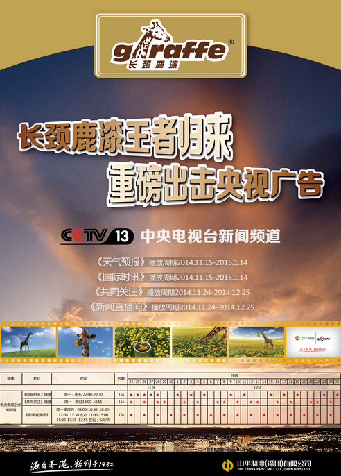 長頸鹿漆品牌投放的選擇如同甄選國際品質的原料供應商一樣,選擇收視率頂尖的中央電視臺新聞頻道(央視十三套),于2014年11月24日正式投放《共同關注》《國際時訊》《新聞直播間》及《天氣預報》欄目全天侯各時段同步播出。