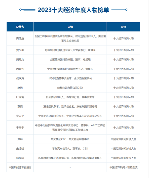 2023中國十大經濟新聞人物榜單正式公布,波司登高德康、海信集團賈少謙、全聚德集團周延龍等企業家被評為十大經濟新聞人物,中國新能源車奮進者獲得中國經濟新聞人物特別獎。據了解,本次評選以“致敬新時代驅動力”為主題,由中國經濟傳媒協會主辦。下面小編為大家整理了2023十大經濟年度人物完整榜單,一起來看看吧!