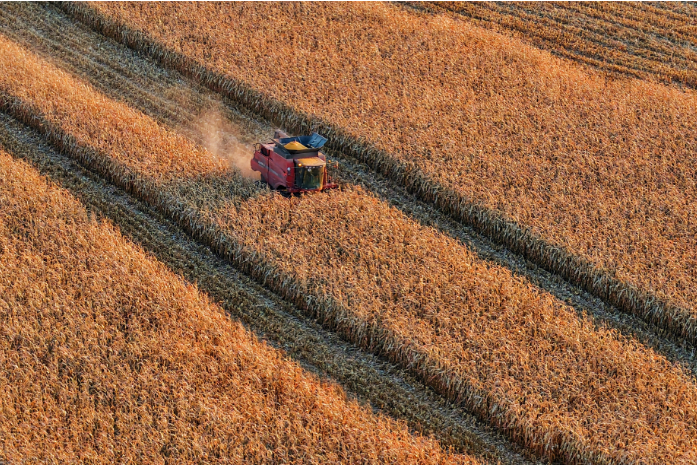 2025年10月14日,在黑龍江同江市街津口赫哲族鄉,農戶在收獲玉米(無人機照片)。新華社發(劉萬平攝)