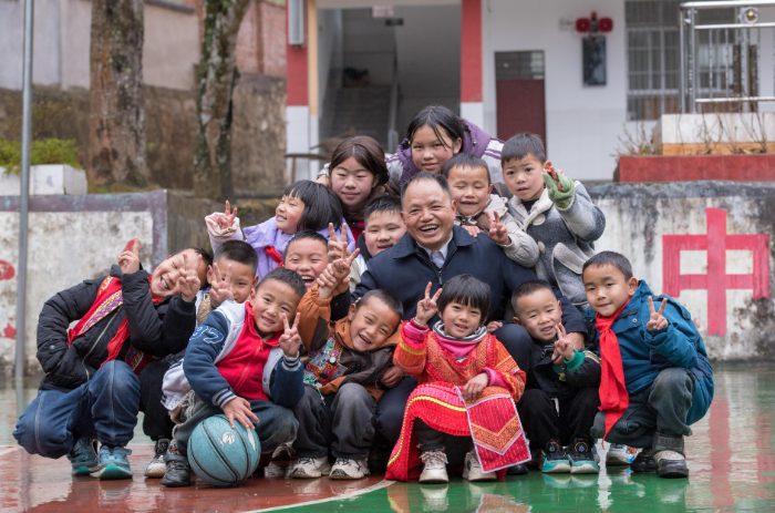 2025年2月18日,在云南文山壯族苗族自治州廣南縣,農加貴和學生們在落松地小學操場上合影。新華社發(彭奕凱攝)