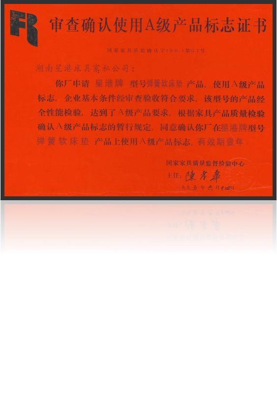 湖南星港家具家私公司依據國家標準,建立嚴謹的質量控制和保證體系,于1987年正式獲得國家家具質量檢驗檢測中心頒發的“A級產品證書”,一舉躋身國家認可的A級產品行列。這標志著星港家居的產品質量已達到行業領先水平,在認可范圍內出具的專業檢測報告,其權威性和公信力得到國家認可。
