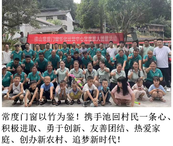 近日,常度門窗積極響應池回村委的號召,為池回村創清廉村居示范點獻計獻策、添磚加瓦,向村委提供“佛山常度門窗懷化運營中心常度家人團建活動”的照片,并配文“常度門窗以竹為鑒,攜手池回村民一條心,積極進取,勇于創新,友善團結,熱愛家庭,創辦新農村,追夢新時代”。此舉動,展現出振興鄉政企業代表該有的責任和擔當。常度門窗正在用自身的影響力,帶動更多企業、社會組織及個人感恩社會,回報社會,以實際行動助力鄉村振興!