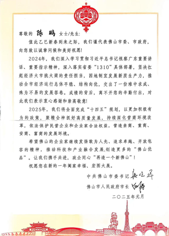 隨著乙已新春的鐘聲即將敲響,佛山市委、市政府向安晨集團及董事長陳鵬先生致以誠摯的問候和美好的祝愿。在這辭舊迎新的時刻,安晨集團作為佛山制造業的代表,不僅收獲了來自官方的肯定與祝福,更以其卓越的使命愿景和全方位的賦能體系,展現了在新一年度中再創輝煌的堅定決心。