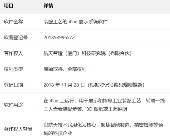 近日,航天智造(廈門)科技研究院(有限合伙)傳來重磅消息,其“裝配工藝的iPad展示系統軟件”成功獲得計算機軟件著作權登記證書(軟著登記號:2018SR996572)。這枚沉甸甸的證書,不僅是對研究院技術創新能力的官方認證,更標志著其在航天技術民用轉化、高端制造數字化升級領域,邁出了扎實且關鍵的一步。