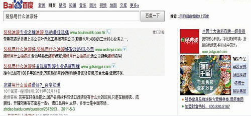 同時,為提升經典漆品牌知名度,配合提升新官網和官方旗艦店的點擊率和關注度,經典漆在“百度”搜索獨家買斷涂料行業“品牌地標”項目,只要在百度搜索“十大油漆品牌”“十大涂料品牌”“內墻漆”“乳膠漆”等與涂料相關的270個關鍵字,即可在右側獨家顯示經典漆圖片、官網和天貓旗艦店等鏈接。