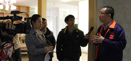 張總接受采訪時為大家介紹圣莉亞智能淋浴房