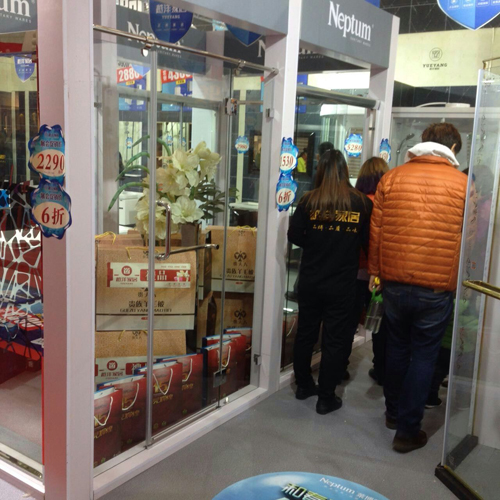 各種豪禮堆滿了萊博頓淋浴房展區(qū)