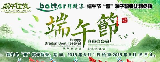 一年一度‘端午節’即將到來,我們能在不平凡中攜手、成長、進步、感恩有您。展望2015年;挑戰競爭,生存與機遇并存,能守住今天才是明天市場的贏者?國家征收涂料稅4%是環保政策偏向也是難得的等待‘機遇’?創造與尋找在于把握,環保新農村建設已經打響。為協助客戶在2015年以迅雷之勢開發市場,激勵各地經銷商加快城鄉終端建設步伐,賀‘拜特歐式水漆’攜巨資強勢登陸展播四大央視頻道‘CCTV1\CCTV2\CCTV7\CCTV12’、聯合7大網絡視頻全天在線、100多家資訊媒體全方位跟蹤報道。“中山拜特涂料有限公司”、“中山市萬誠涂料涂料有限公司”全體、全員、全面市場投入,同時‘端午節’來臨之際,公司‘端午節“惠”粽子飄香讓利促銷’活動開始了具體方案如下: