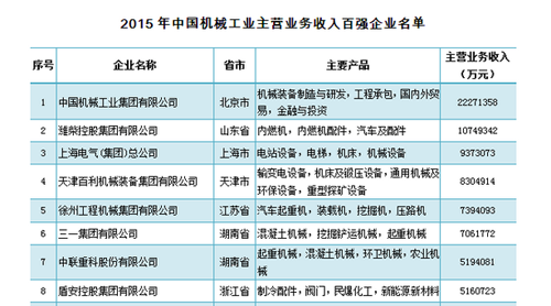 2015年機械工業(yè)百強企業(yè)中,有2家規(guī)模超過千億元,8家規(guī)模超過500億元。徐州工程機械集團有限公司主營業(yè)務(wù)收入739.4億元,排名第五位,連續(xù)27年保持工程機械行業(yè)第一位,也是前十強中唯一一家江蘇企業(yè)。
