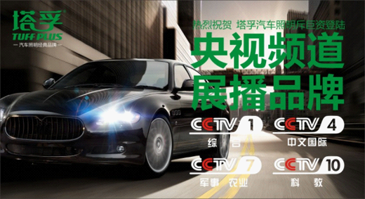隨著LED的誕生,汽車照明行業加速洗牌。塔孚汽車照明繼榮獲“中國十大汽車照明品牌”后,重拳出擊央視,與央視強強聯手,塑造知名企業形象,其宣傳廣告片在央視CCTV-1、CCTV-4、CCTV-7、CCTV-10四大頻道火熱開播,實現品牌跨越式發展,造就著名汽車照明品牌。