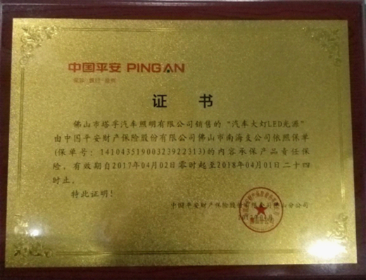 汽車用品嚴重關系到車載安全,為保障各大消費者在使用塔孚照明后得到保障,2017年4月2日,塔孚汽車照明斥資投保中國平安。此舉印證著塔孚汽車照明對消費者的無限重視,塔孚持續護您安全出行。