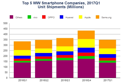 說起國產手機的“老大哥”,我們第一個聯想到的肯定是華為。日前,根據權威市調機構IDC的最新數據,2017年第一季度全球智能手機出貨量3.474億部,同比增長4.3%,略高于預期的3.6%。