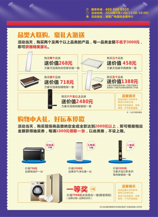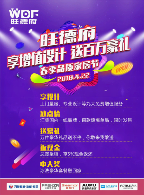 為了讓消費者用更實惠的價格享受高品質的產品,旺德府集團匯集了國內一線品牌中近百款驚爆價商品參與這次活動,消費者購物還能享受到免費上門量房、免費專業設計等九大免費增值服務,現場還有全款返現金、中大獎的活動,更是精心準備了萬件豪華禮品送給消費者,只為能讓消費者實實在在的感受到旺德府集團對消費者的回報,同時為消費者全方位的品質生活做好服務。