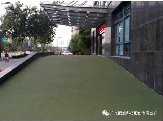 騰威針對市面上脆性高的彩色樹脂膠粘劑而導致瀝青基礎或橋梁工程出現的不規則裂紋的情況,研發了彩色防滑膠粘劑S-20PU,是采用EPU(Epoxy Poly-Urathane Hybrids System)技術的雙組份環氧改性聚氨酯改色磨耗材料,甲組為有機硅改性聚異氰酸酯,乙組為環氧雜化改性聚氨酯聚合物、填料、色漿、助劑混合組成的無溶劑漿料。甲乙組按比例混合后,滾涂或刮涂在瀝青基礎、混凝土基礎或鋼橋面,均勻拋撒耐磨骨料快速成型。該系統具備耐候性好、附著力高、有韌性不開裂、耐磨止滑、色彩鮮艷的特性。