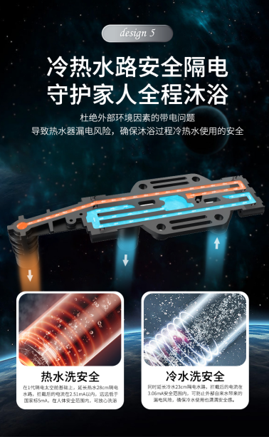 此外,格美淇專利隔電太空艙2.0裝置配備一體往復式超長安全水路設計,可延長熱水28cm+冷水23cm隔電水路。洗浴中萬一發生漏電,由“隔電太空艙2.0”主動攔截后的電流在2.51mA(熱水)與3.06mA(冷水)以內,遠遠低于國家標準5mA安全電流,可減少因別處意外漏電而帶來的觸電傷害,實現沐浴冷熱用水全程安全防護。
