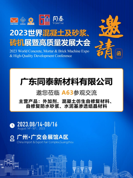 2023年8月14-16日,為期三天的“2023第3屆世界混凝土及砂漿展”將于廣州廣交會展館隆重舉辦。本次盛典,同泰新材料將與廣大客戶共同見證混凝土行業的蓬勃發展。與此同時,同泰將攜混凝土仿生自修復材料、自修復防水砂漿等高品質產品亮相,一展“全球十大防水材料品牌”風采。