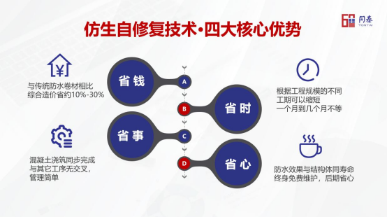 同泰堅守“品質之心,匠人之道”,以自主研發的混凝土自修復技術完善現行建筑技術體系,為建筑物提供優質的防水、防腐保護,助力建筑百年大計。