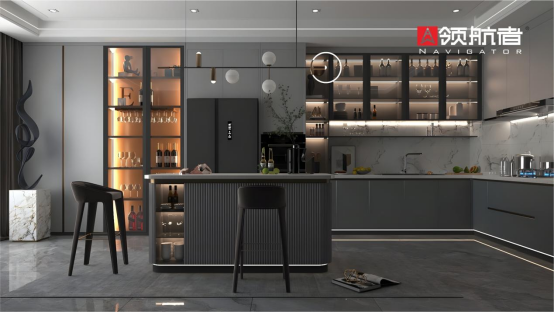 領航者家居突破傳統思維習慣,讓餐廳邂逅廚房,打造餐廚一體化,形成視覺上的空間延伸感。以意式拉手加以點綴,與黑白根巖板平衡搭配,化解了空間的單調與乏味,營造出深邃又富有質感的餐廚空間設計。讓美食的香味彌漫整個空間,讓家的快樂、幸福、溫暖在這個空間里盡情發酵。