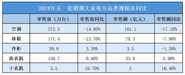 今年的五一,旅游城市被擠爆,而家電的門店大多是冷冷清清。據(jù)奧維云網(wǎng)(AVC)推總數(shù)據(jù),五一促銷期國內(nèi)大家電零量631萬臺,同比下滑10.2%,零售額233億元,同比下滑9.5%。其中空調(diào)零售量、零售額同比都是雙位數(shù)下滑,且零售額下滑幅度大于零售量下滑幅度,說明均價依舊下行。