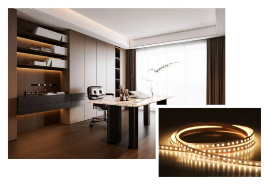 有強有弱才能稱之為重點,所以不是放一盞燈就能成為重點的。為了不喧賓奪主,書房其他區域的用光就一定要克制。所謂克制,可以視為補充用光,補充用光的關鍵字是“柔”,開爾照明【精品系列低壓燈帶】90高顯指,無頻閃無藍光,書房補充光非它莫屬。