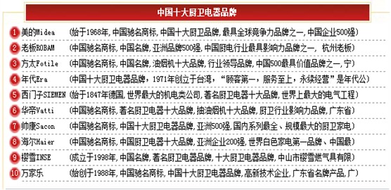 2012年中國十大廚衛電器品牌排行榜,著名廚衛電器權威排名:
